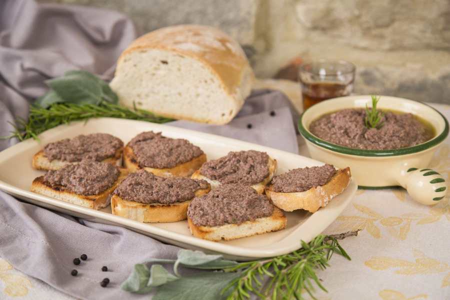 Odori 5 minuten aanzweten in olijfolie. De levertjes en de ansjovis toevoegen, kruiden met peper en weinig zout en 10 minuten bakken op een zacht vuurtje. Voeg de Vin Santo (of witte wijn) en de kappertje toe, en laat nog enkele minuten sudderen. Verwijder de rozemarijn, en hak de ingrediënten fijn met een mezzaluna of een groot koksmes. Besmeer de crostini royaal met de paté en serveer, bij voorkeur als onderdeel van een antipasto misto.